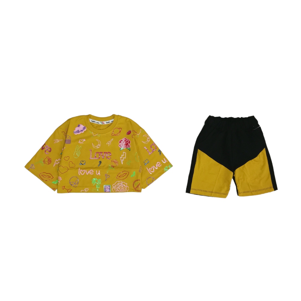 طرح و رنگ شاد: این ست کراپ شلوارک بچگانه با رنگ اصلی خردلی و طرح‌های گرافیکی متنوع و رنگارنگ از قلب‌ها، گل‌ها، و نوشته‌های “Love” و “Love U” پوشیده شده است که حس شادی و انرژی را به استایل شما می‌آورد.